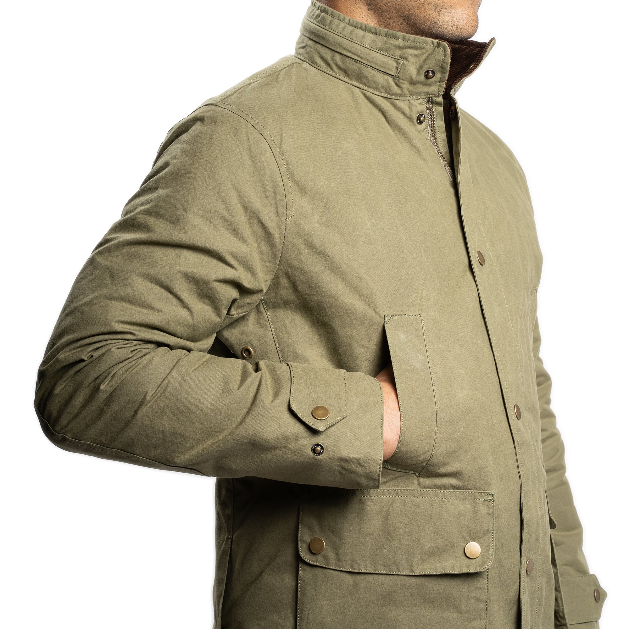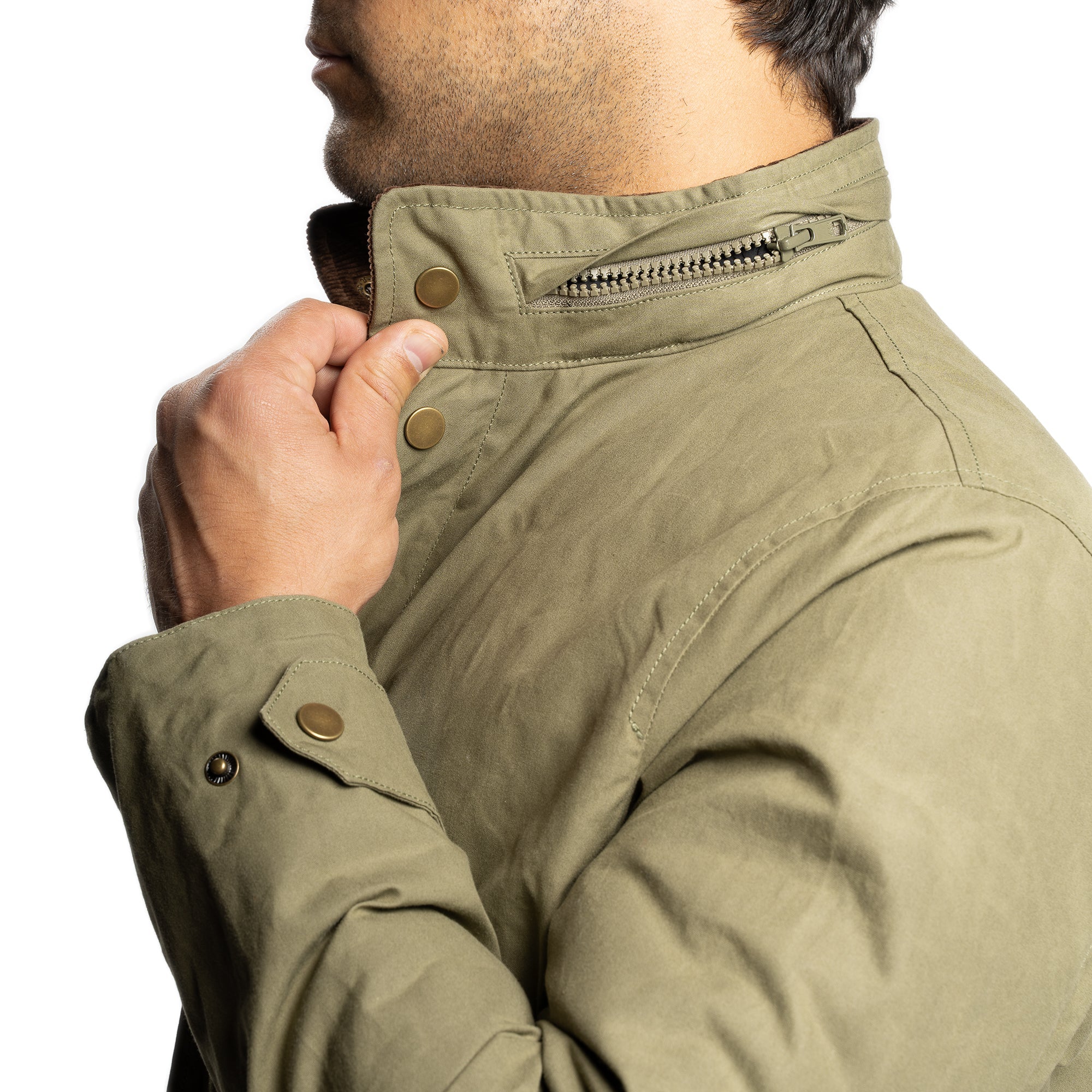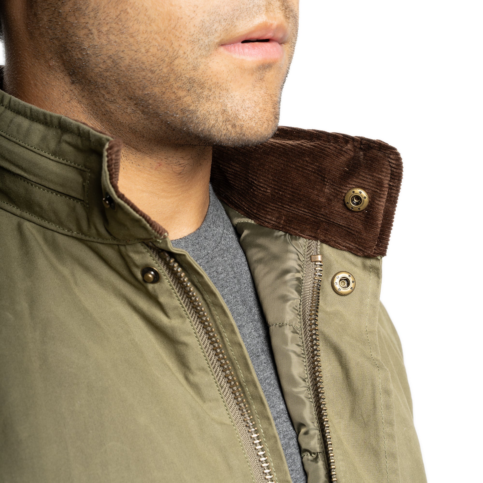 • Collar Style: Straight collar with a zipper on the back of the collar (hidden zipper) for a hood + corduroy on the inner collar